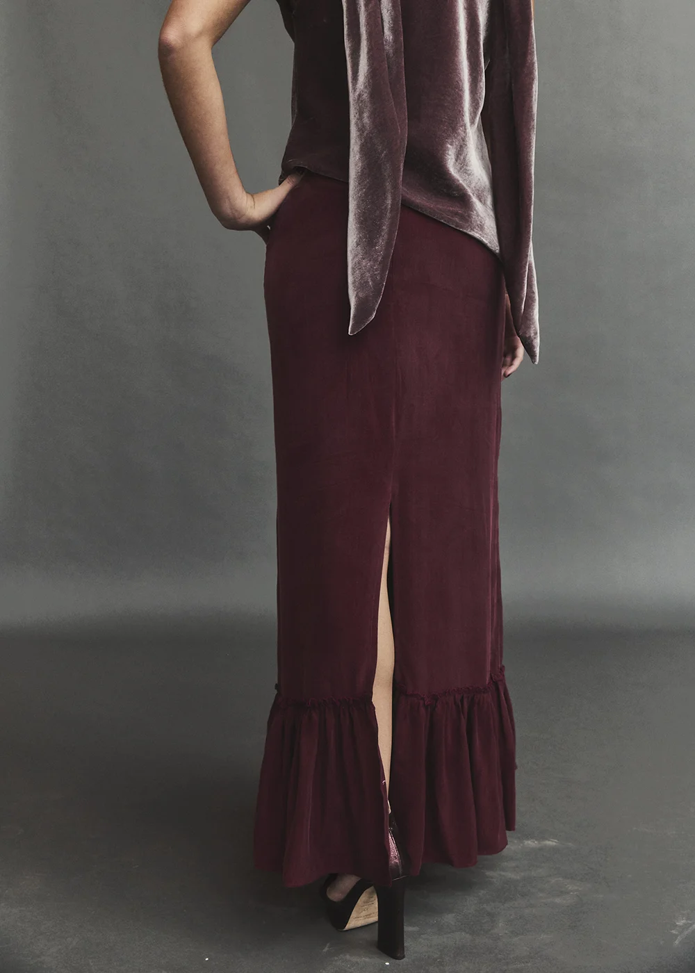 Falda 100% cupro en color granate (vino) con volante en la parte de abajo.