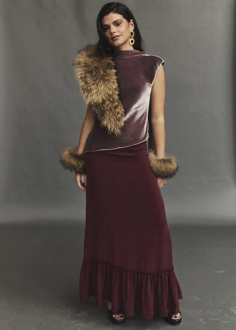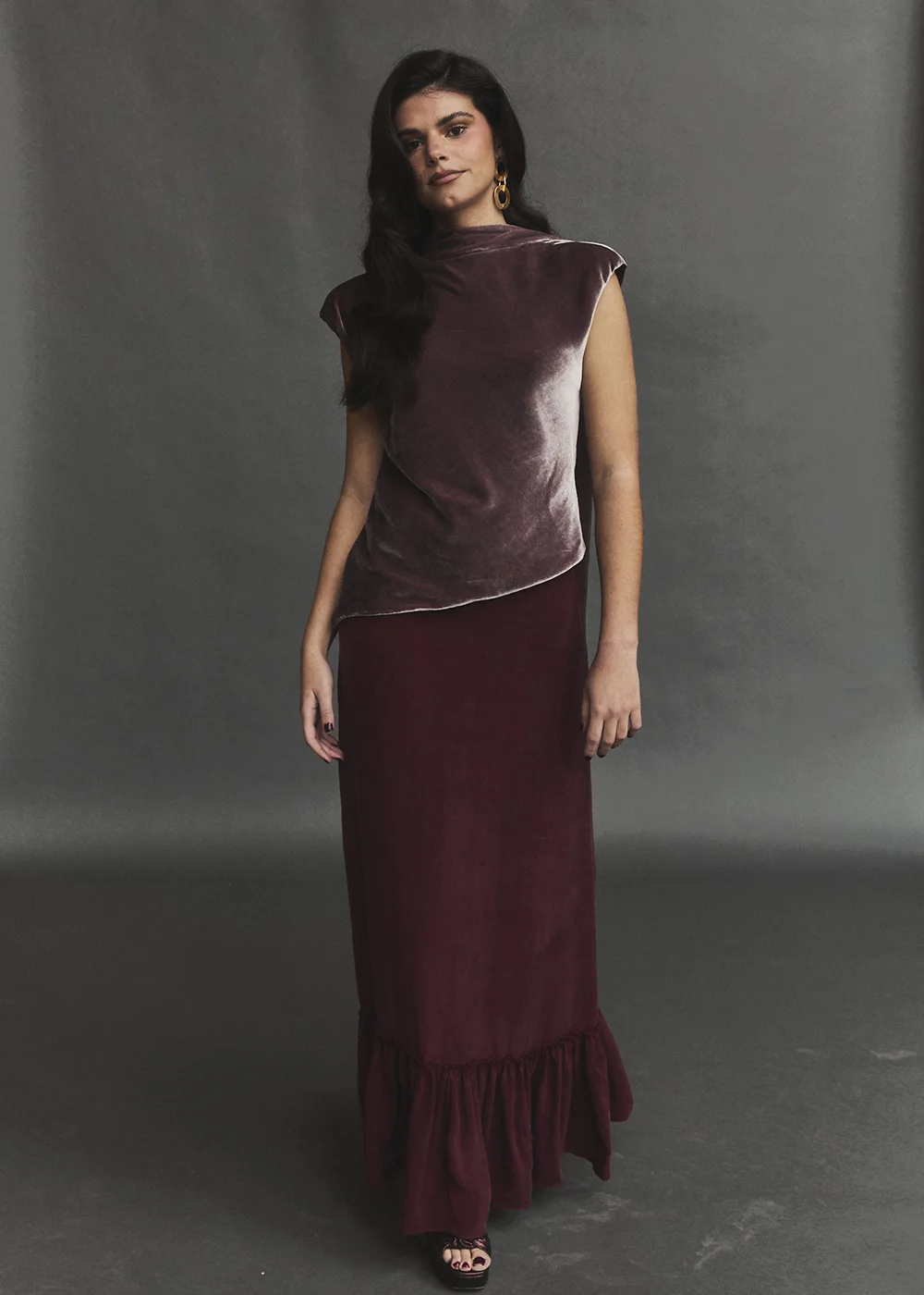 La falda Clotilde destaca por su profundidad de color y su caída elegante. El volante inferior aporta ritmo y presencia, evocando una feminidad clásica con un aire contemporáneo. Una prenda que invita a vestirse despacio y a disfrutar de los pequeños detalles.